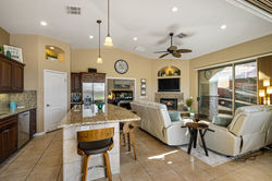 Solid-Roof Patio: Rear patio offers an extensive covered patio with sunshades and rolling metal shutters and a large outdoor bar with BBQ Grille, Undercounter Fridge, Beverage Fridge and Sink.