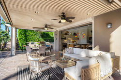 15'-Deep Patio Cover with recessed Lighting, Space Heaters, and Electric Sunshades on all-three sides, keeps in the warmth on chilly evenings.